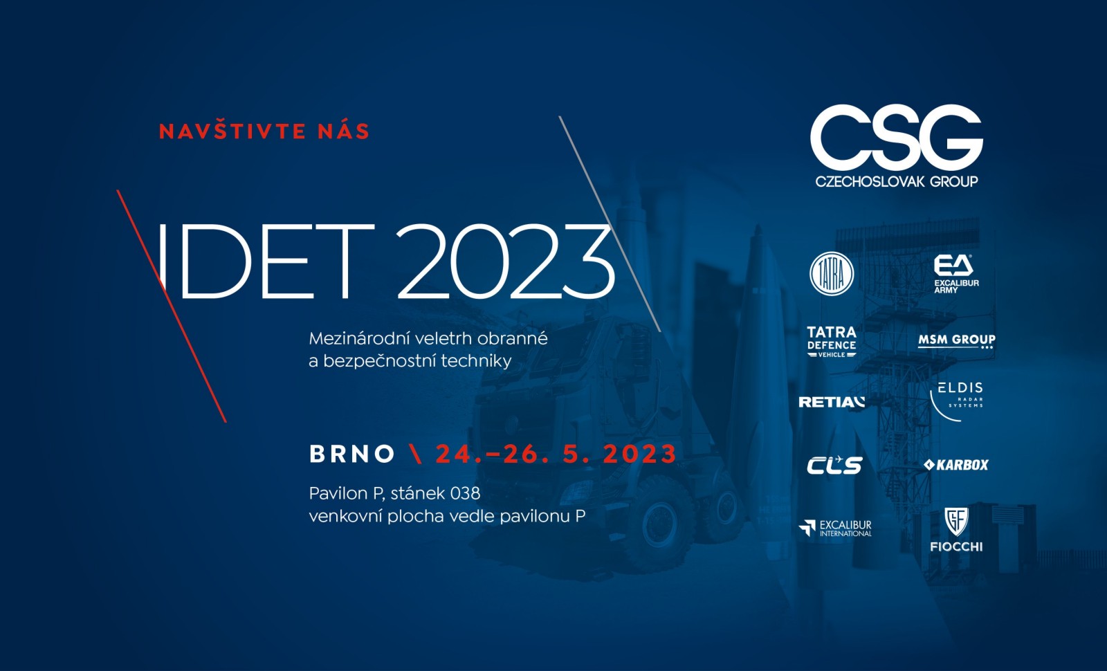 Na stánku se budou prezentovat firmy Tatra Trucks, Tatra Defence Vehicle, Excalibur Army, Retia, Eldis, MSM Group, Karbox, Excalibur International, Česká letecká servisní a Fiocchi Munizioni. „Veletrh IDET je největší přehlídkou obranných technologií v Česku a je také velkou příležitostí prezentovat produkty a služby zástupcům české armády a ministerstva obrany i zákazníkům ze střední Evropy. Navíc Česko a Evropa jsou domovské regiony většiny našich firem, proto je pro ně IDET velmi důležitá událost, o čemž svědčí i velikost naší expozice,“ řekl Radim Ochvat, ředitel korporátních vztahů, komunikace a marketingu holdingu CSG.