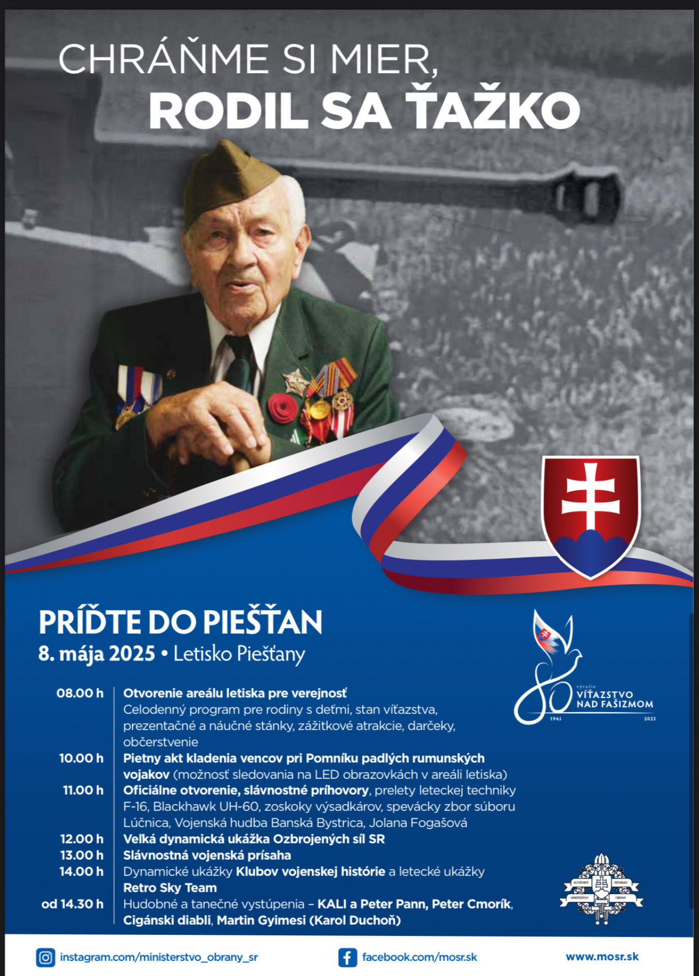 Vláda Slovenskej republiky na dnešnom výjazdovom rokovaní v Malej Lehote schválila organizačné zabezpečenie osláv 80. výročia nad fašizmom, ktoré sa uskutočnia 8. mája na letisku v Piešťanoch. „Pozývam všetkých do Piešťan na celoslovenské oslavy 80. výročia víťazstva nad fašizmom na bohatý a dynamický program ozbrojených síl, a všetkých našich zložiek a za účasti ďalších ministerstiev. Takže, ešte raz pozývam celé Slovensko do Piešťan,“ povedal podpredseda vlády a minister obrany SR Robert Kaliňák.