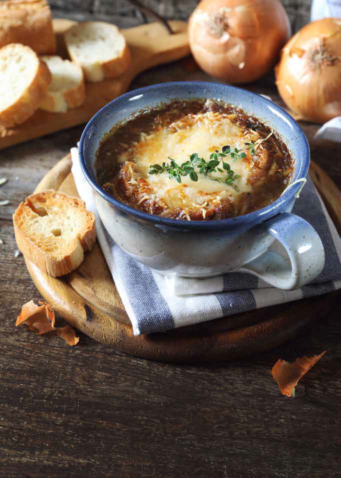 Cibuľu ošúpte a nakrájajte na tenké mesiačiky. V hrnci roztopte maslo, pridajte tymian, mleté korenie a nakrájanú cibuľu, restujte, kým nezíska zlatistú farbu. Prisypte cukor, prilejte koňak a nechajte chvíľu povariť, aby sa chute spojili. Potom poprášte cibuľovú zmes múkou a zľahka orestujte. Zalejte vývarom a varte asi 15 minút, kým cibuľa nezmäkne. Plátky bagety opečte na troche oleja, posypte strúhaným syrom a jemne zapečte v rúre, kým sa syr nerozpustí a nezačne bublinkovať. Polievku rozdeľte do misiek a podávajte so syrovými hriankami.