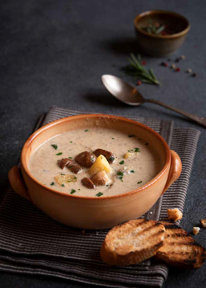 Sušené huby zalejte teplou vodou a dajte ich bokom, aby zmäkli. Nadrobno nakrájanú cibuľu s cesnakom osmažte na oleji. Namočené huby zlejte a spolu so šampiňónmi ich pridajte do hrnca. Chvíľu ich orestujte a pridajte sušené slivky a nakrájané zemiaky. Všetko zalejte vodou a vývarom, pridajte bobkový list, nové korenie, bylinky, čierne korenie a soľ. Len čo sú zemiaky uvarené, polievku dajte preč zo sporáka a vyberte z nej väčšinu zemiakov a húb. Do polievky nalejte smotanu a rozmixujte ju ponorným mixérom. Zemiaky a huby, ktoré ste si dali bokom, vráťte do hrnca a premiešajte. Podávajte ozdobené petržlenovou vňaťou.