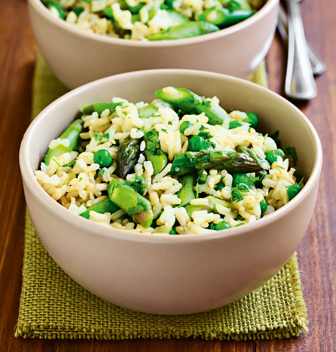 Do uvarenej ryže primiešajte mrazený hrášok, mrazené fazuľkové struky a na kúsky nakrájanú špargľu. Zakryte a nechajte približne 5 minút dôjsť, aby zelenina zmäkla, ale ostala svieža. Nakoniec vmiešajte strúhaný parmezán, dochuťte soľou a čerstvo mletým čiernym korením a podávajte teplé.