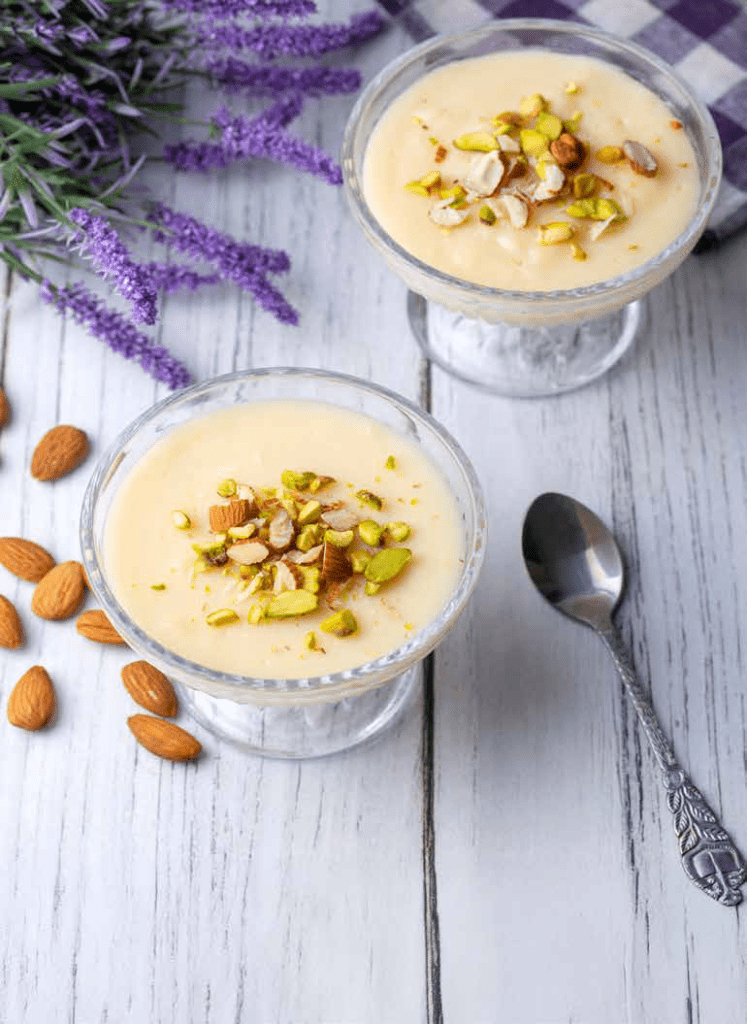 Hotový puding rozdeľte do pohárov alebo misiek a nechajte ho najskôr asi 30 minút vychladnúť. Potom ho dajte do chladničky na minimálne 2 hodiny, aby dobre stuhol. Pred podávaním ho môžete ozdobiť podľa chuti mandľami a pistáciami.