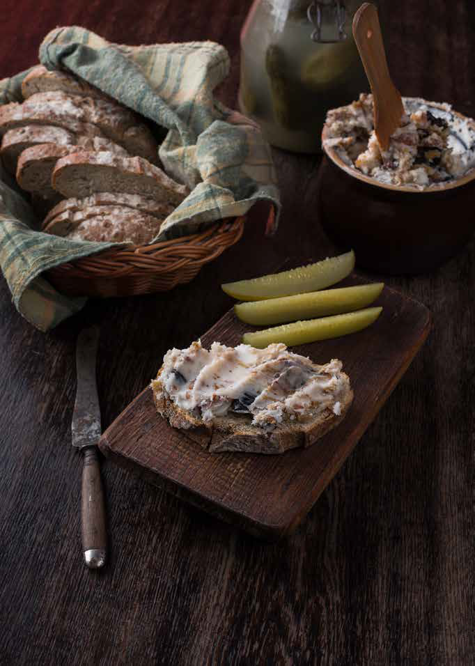 Mäso nakrájajte na hrubšie plátky a následne na väčšie kúsky, približne 4 × 4 cm. Korenie s rascou rozdrvte v mažiari. Horčicu a koreninovú zmes premiešajte s mäsom a nechajte ho odpočívať v chladničke asi hodinu. V pekáči si rozohrejte bravčovú masť a mäso na nej zľahka zatiahnite, len kým získa zlatistú farbu. Osoľte ho, premiešajte a do pekáča pridajte ďalšiu masť tak, aby bolo mäso celé ponorené. Na miernom plameni ho konfitujte 4 až 5 hodín pri teplote približne 80–120 °C, mäso sa nesmie smažiť, len jemne pobublávať.