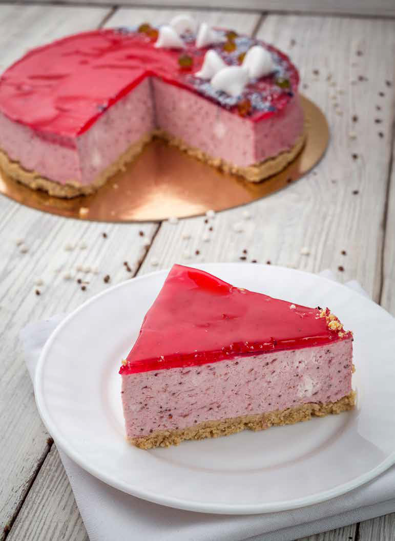 Najprv rozmixujte sušienky a zmiešajte ich s roztopeným maslom. Zmes nasypte do okrúhlej tortovej formy s priemerom 24 cm (spodok môžete vyložiť papierom na pečenie), zarovnajte a dajte do chladničky. Vyberte smotanu, mascarpone a tvaroh z chladničky a nechajte ich zohriať na izbovú teplotu. V hrnci zmiešajte maliny, vodu a cukor a priveďte do varu. Varíme približne 10 minút, pričom zmes občas premiešajte, potom odstavte a rozmixujte. Zmes nechajte mierne vychladnúť na izbovú teplotu. Vo väčšej miske vyšľahajte smotanu, postupne pridávajte mascarpone a tvaroh a nakoniec opatrne vmiešajte vychladnutú malinovú zmes. Hotový krém natrite na pripravený korpus, zarovnajte a nechajte stuhnúť v chladničke. Pripravte červené tortové želé podľa návodu na balíčku, nechajte ho vychladnúť na izbovú teplotu a potom ním zalejte tortu.