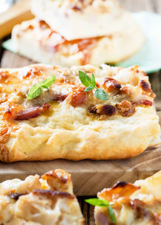 3. Pred pečením posypte cesto nakrájanou slaninou a pečte asi 20 minút pri 220 °C. Po upečení potrite ešte horúci meteník cesnakovou pastou.