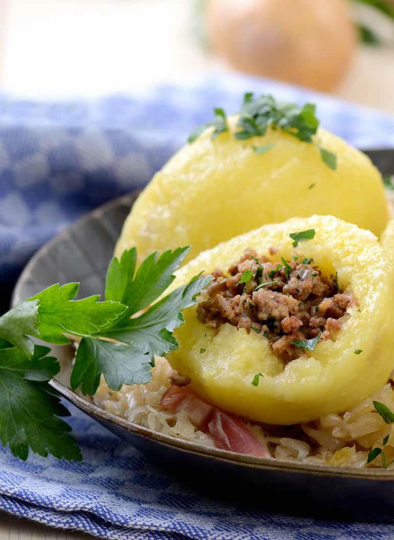 Kyslú kapustu ochutnajte a ak je príliš kyslá alebo slaná, opláchnite ju pod tečúcou vodou podľa preferencií. Slaninu nakrájajte na malé kocky, opečte dozlatista, pridajte nakrájanú cibuľu, krátko ju osmažte, prisypte kapustu, osoľte, okoreňte a duste, kým nezmäkne. Mäso orestujte na masti, osoľte, okoreňte, pridajte pretlačený cesnak a duste asi 10 minút, potom nechajte vychladnúť. Zemiaky v šupke uvarte deň vopred, ošúpte, pretlačte a pridajte múku, soľ a vajce, pričom múku pridávajte postupne, aby cesto nebolo lepkavé, ale ani príliš tuhé. Cesto rozvaľkajte na hrúbku približne 1 cm, nakrájajte na štvorčeky, do stredu dajte plnku a vytvarujte guličky. Tie vložte do vriacej vody a varte približne 15 minút, pričom čerstvo naplnené guľky treba variť hneď, aby sa nerozpadli.
