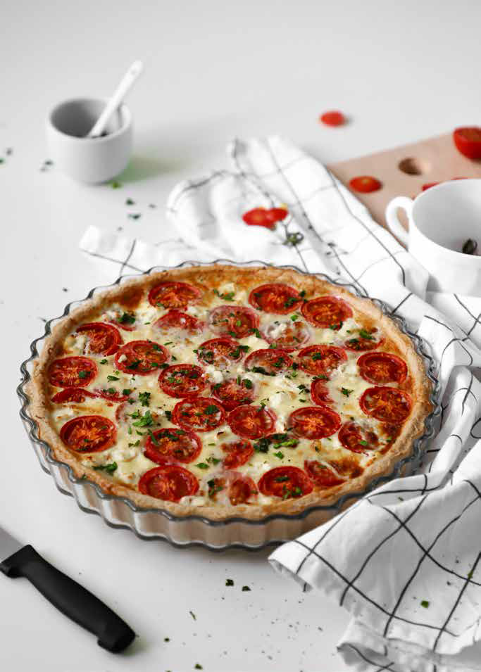 Dno cesta na quiche potrite dijonskou horčicou. Navrch pridajte scedeného tuniaka z konzervy. Vaječnú zmes nalejte na tuniaka a prikryte plátkami paradajok.