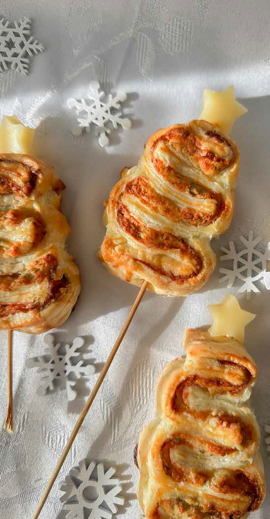 Cesto narežte na 8–10 pásikov, ktoré zložte do tvaru stromčeka. Takto pripravené stromčeky prepichnite drevenou špajdľou, uložte na plech vystlaný papierom na pečenie a dajte piecť do rúry vyhriatej na 180 °C. Pečte asi 25 minút alebo do zlatista. Na dozdobenie stromčekov môžete použiť plátky tvrdého syra, z ktorého vykrojíte hviezdičku a tú následne napichnete na špajdľu na vrchu stromčeka.