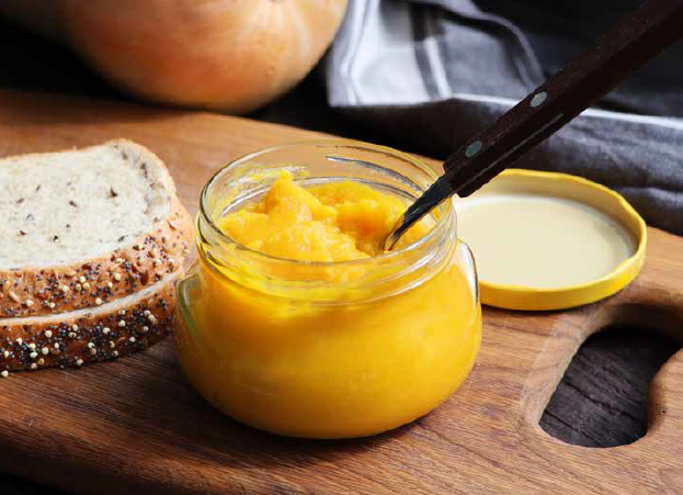 Tekvicu ošúpte, zbavte jadierok a nastrúhajte najemno. Nadrobno nakrájanú cibuľu opečte na oleji, pridajte nastrúhanú tekvicu, cesnak a cukor. Varte, kým tekvica nezmäkne, potom pridajte horčicu, ocot, korenie a soľ podľa chuti.Nakoniec všetko pomixujte na jemnú kašu. Udržujte v chlade, vydrží asi 4 dni. Možete ju takisto sterilizovať a použiť neskôr.