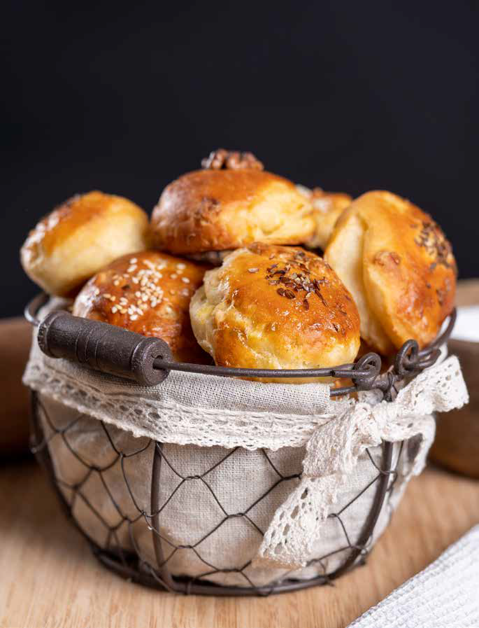 Hotové cesto rozvaľkajte a preložte na polovicu. Nechajte ho chvíľu nakysnúť a postup zopakujte. Potom cesto vyvaľkajte na hrúbku asi 3 – 3,5 cm a pomocou vykrajovača alebo pohára vykrajujte pagáče. Pagáče poukladajte na plech vystlaný papierom na pečenie, potrite žĺtkom a posypte sézamom. Pečte na 200 °C približne 20 – 25 minút.