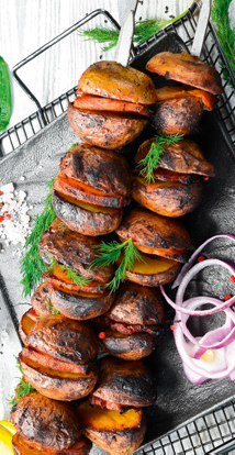 Zemiaky pokrájame na polovice, vložíme do hrnca, pridáme vodu a pol lyžice soli. Privedieme do varu a 8 minút povaríme. Scedíme ich a necháme vychladnúť. V mise zmiešame olej s 1/2 lyžičky soli a korením. Pridáme zemiaky a slaninu a premiešame ich. Na každý zo štyroch dlhých kovových špízov striedavo napichujeme kúsky slaniny a zemiaky a pritlačíme ich blízko seba. Grilujeme zo všetkých strán v stredne vyhriatom grile 10–15 minút.