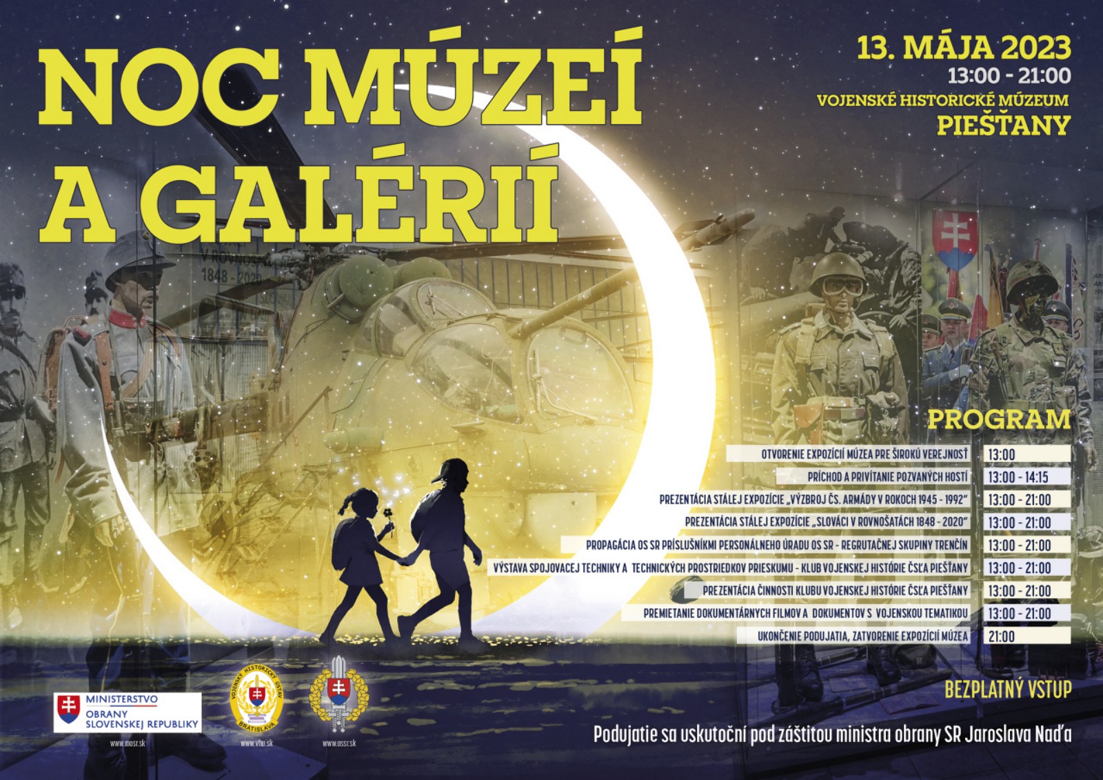 19. ročník podujatia Noc múzeí a galérií 2023 sa uskutoční v jeden deň na celom Slovensku, pri príležitosti Medzinárodného dňa múzeí. Návštevníci Vojenského historického múzea sa budú môcť v priestoroch Múzejného oddelenia Piešťany a Múzejného oddelenia Svidník oboznámiť so zmodernizovanými expozíciami približujúcimi vojenskú minulosť Slovenska. Pre návštevníkov podujatia bude pripravený bohatý kultúrno-spoločenský program. Zároveň je pre fanúšikov vojenskej histórie pripravený veľmi bohatý program v online priestore VHÚ Bratislava.