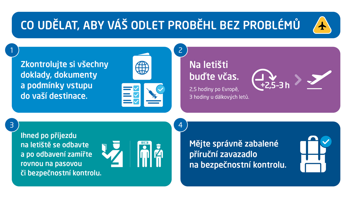 – dostatečnou časovou rezervu na cestu na letiště a průchod samotným letištěm, i když půjde o online odbavení – na letišti je ideální být 2,5 hodiny před odletem po Evropě, 3 hodiny a víc u dálkových spojů a v případě, že má cestující nadrozměrné zavazadlo.