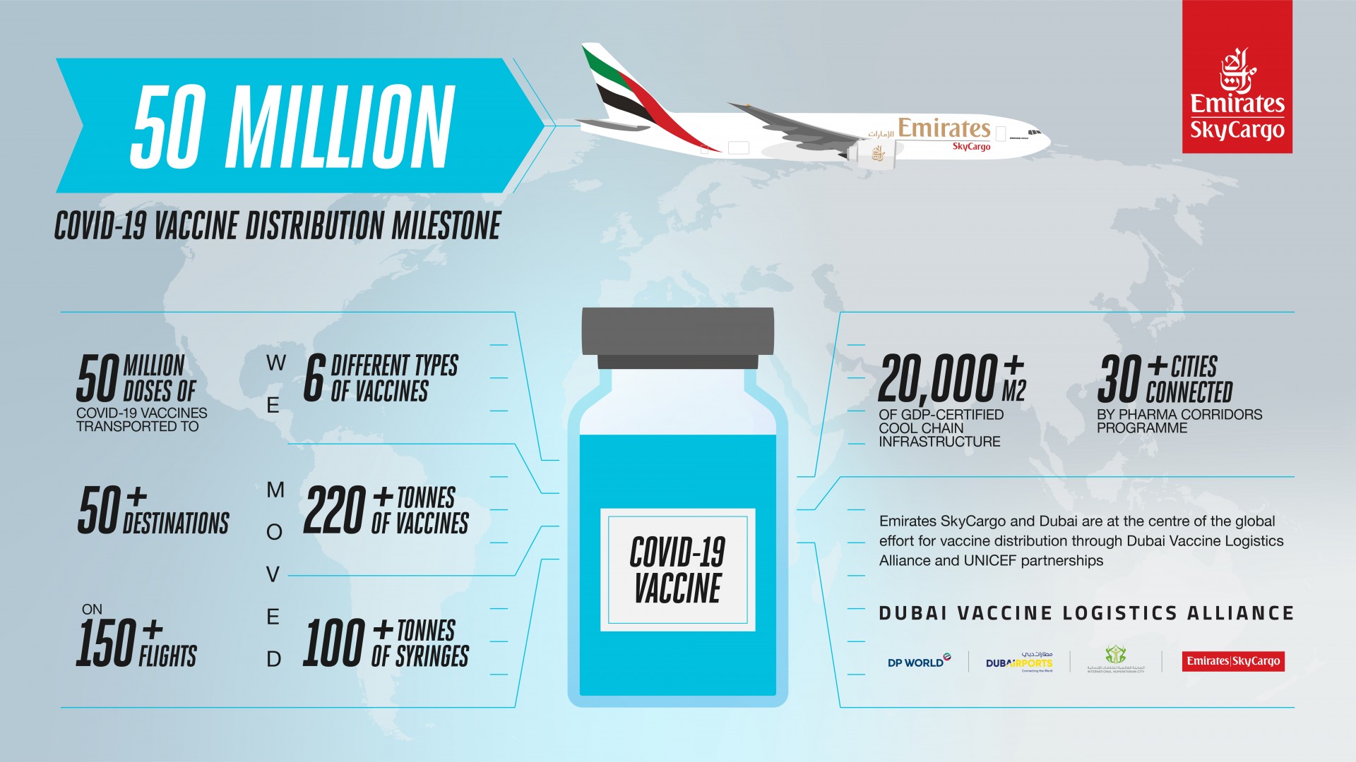 Již v říjnu loňského roku Emirates SkyCargo zřídila v Dubaji letecký uzel s certifikací GDP (osvědčení distribučních postupů) pro skladování a distribuci vakcín proti Covid-19. Díky propracované infrastruktuře a rozsáhlé skladovací kapacitě se společnosti podařilo přepravit velké množství vakcín z místa produkce, následně je společnost uskladnila v Dubaji a poté prostřednictvím nákladních letů pravidelně doplňovala zásoby vakcín v rozvojových zemí s omezenou infrastrukturou chladících řetězců.
