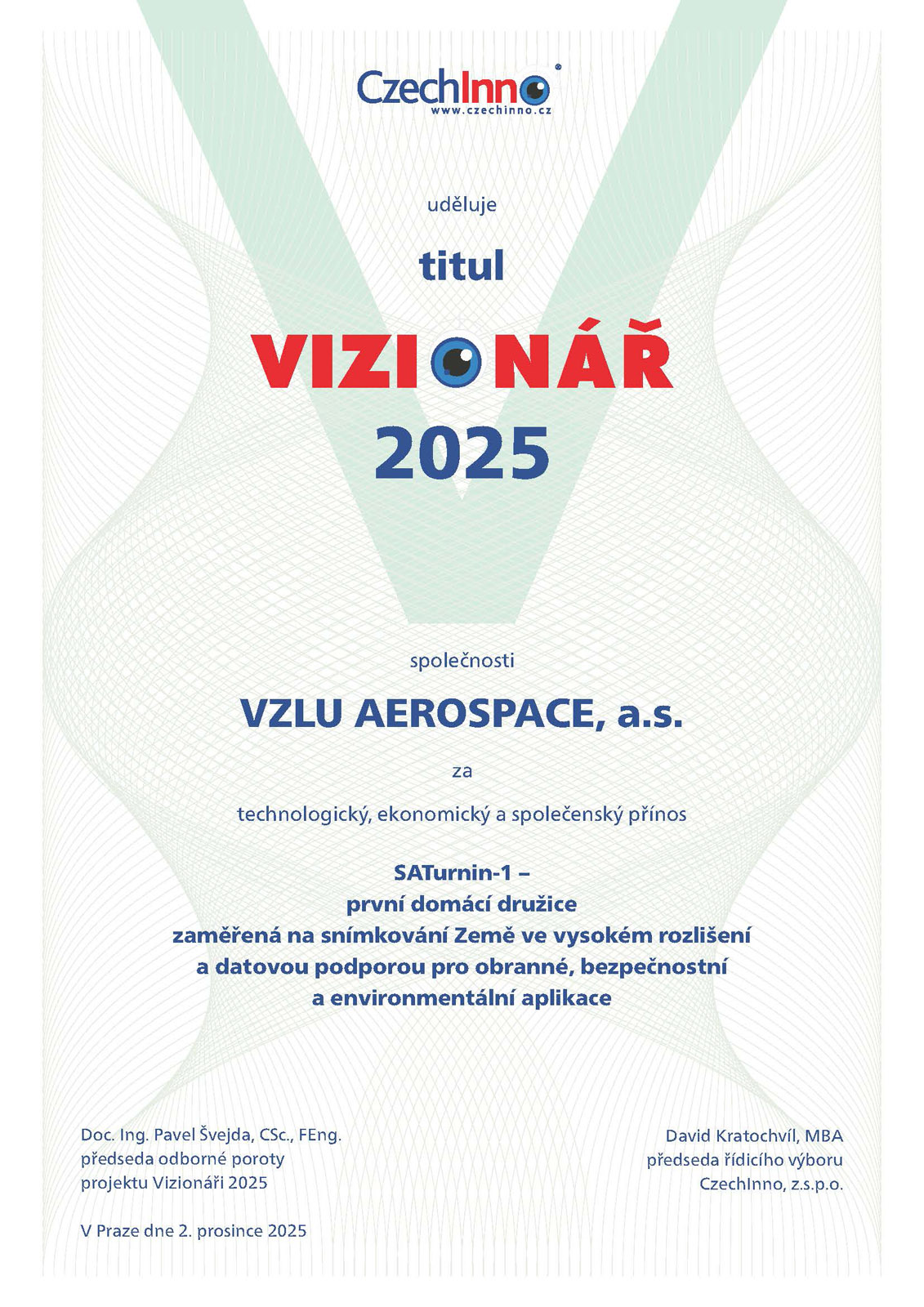Titul Vizionář 2025 za technologický, ekonomický a společenský přínos družice SATurnin-1 – české družice zaměřené na snímkování Země a datovou podporu pro obranné, bezpečnostní a enviromentální aplikace.