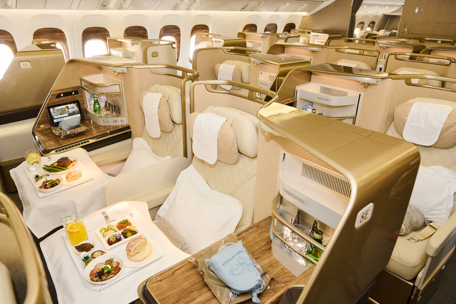 Modernizovaný Boeing 777 společnosti Emirates se čtyřmi třídami nabízí vylepšené interiéry s novými designovými prvky a speciálně navrženými motivy stromu Ghaf včetně dřevěných dekorů ve všech kabinách. Každé letadlo má 260 sedadel nejnovější generace v ekonomické, 24 sedadel v prémiové ekonomické, 38 sedadel obchodní v uspořádání 1-2-1 a osm uzavřených suit v první třídě.