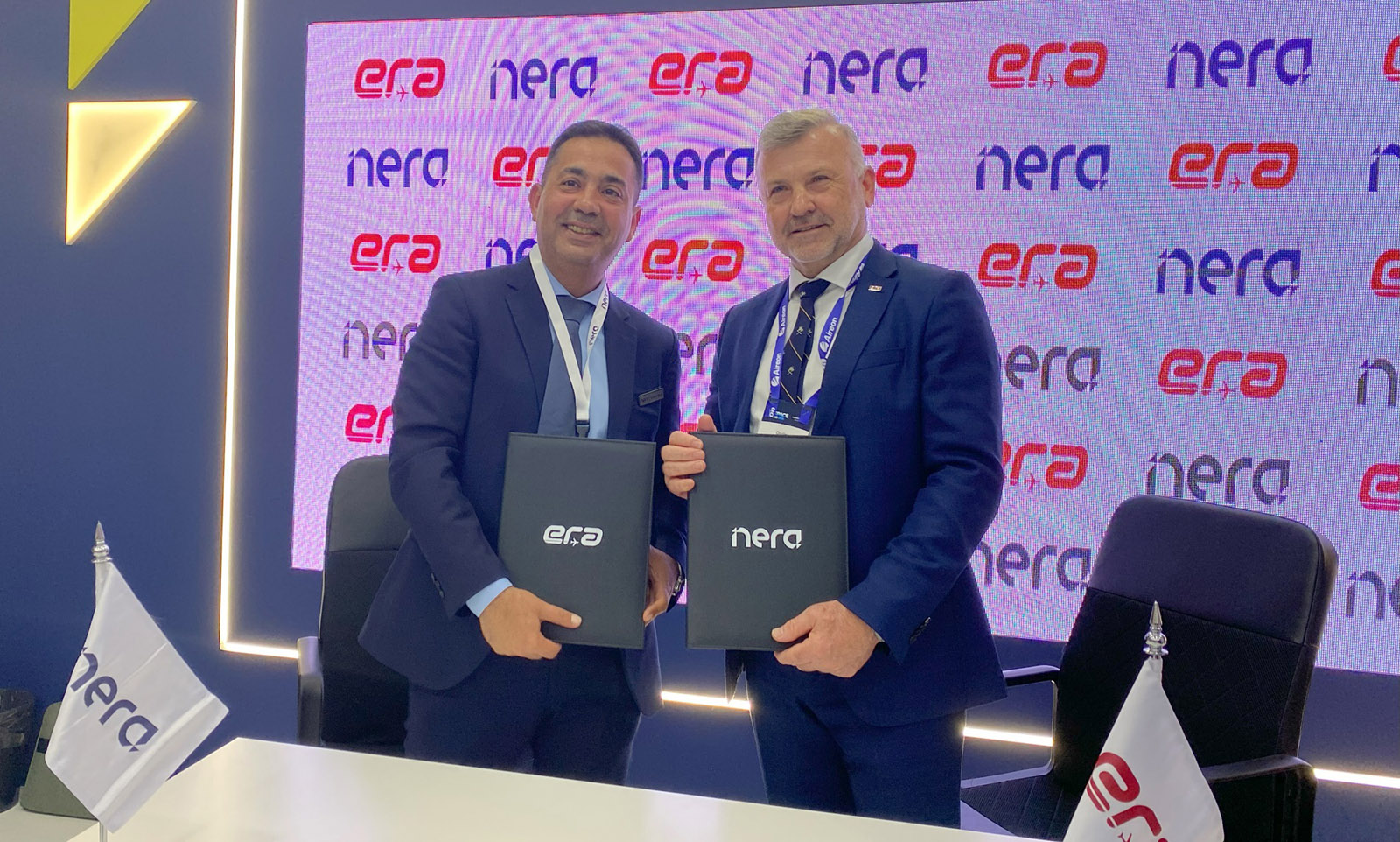 Ondřej Chlost, generální ředitel a předseda představenstva ERA, a Khalid Attiah, generální ředitel NERA, podepsali MoU při ceremoniálu na stánku NERA během výstavy Airspace World 2025 v portugalském Lisabonu, kde obě firmy vystavovaly.