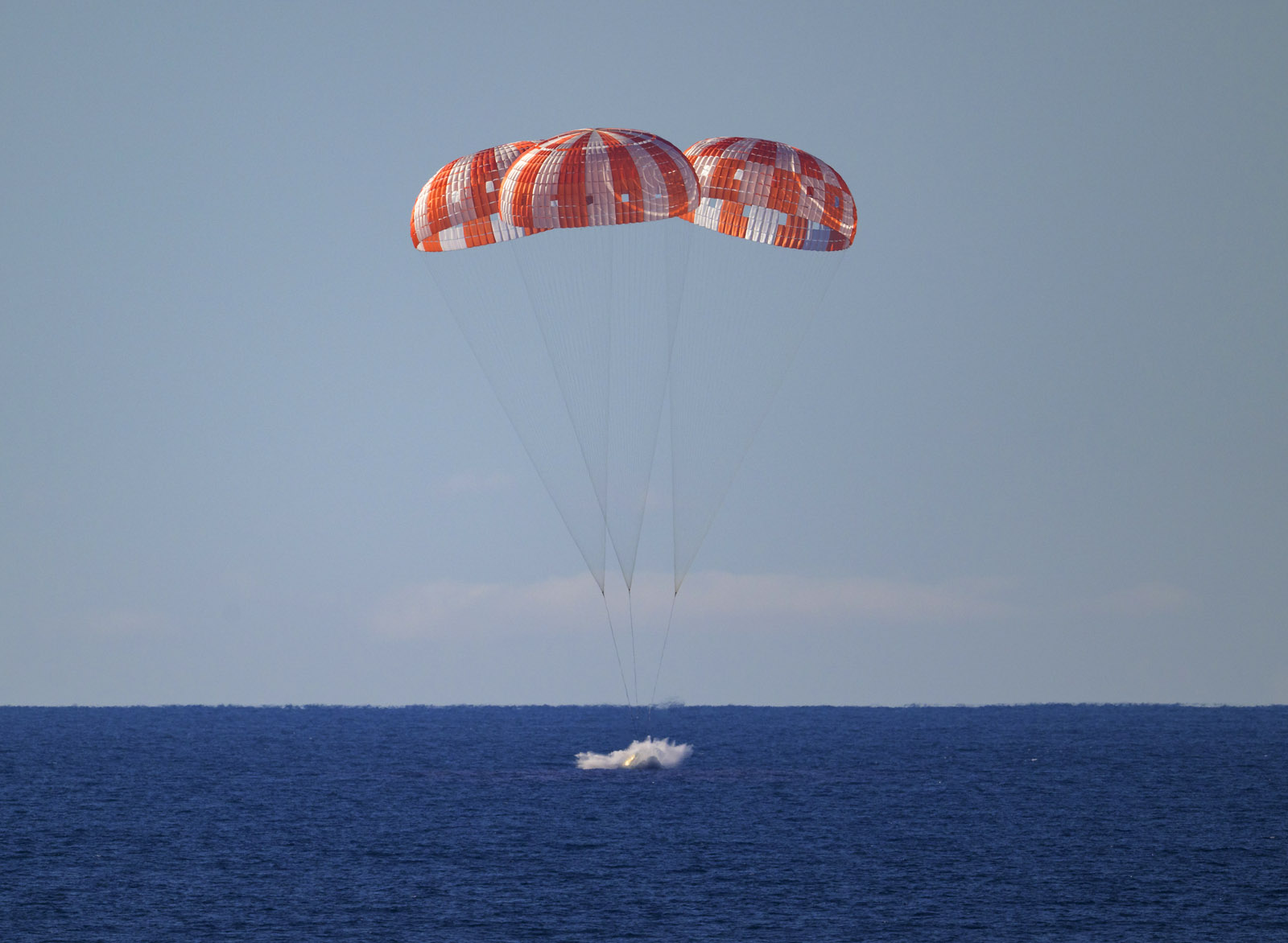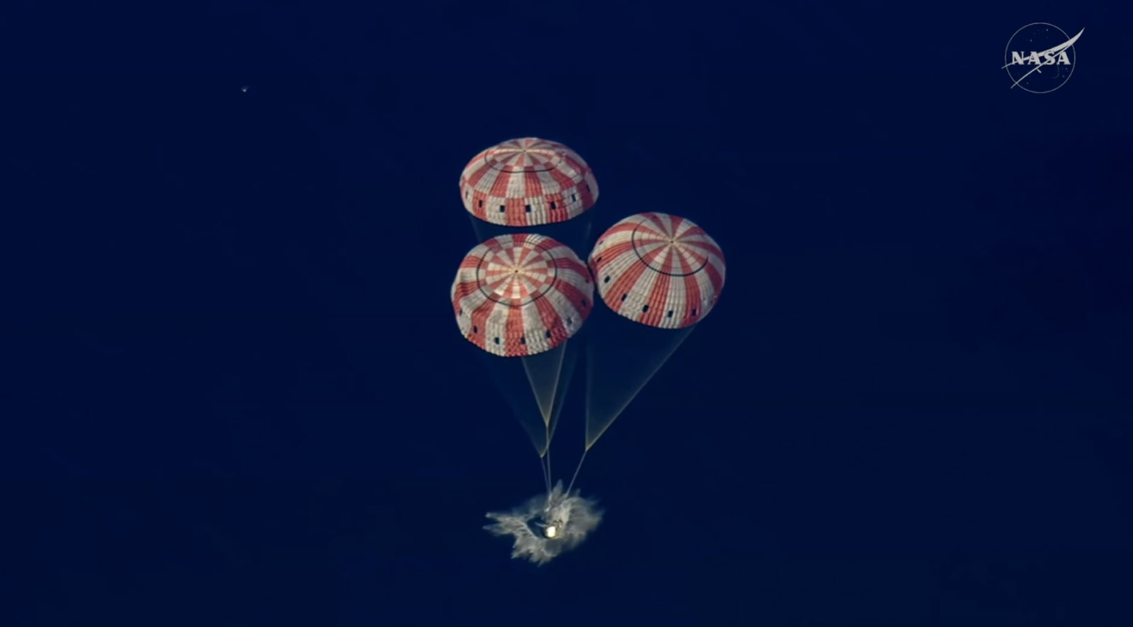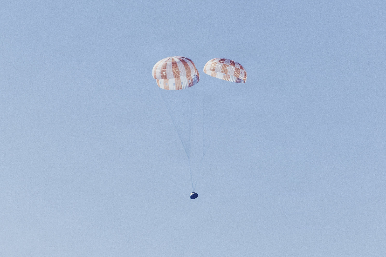 Po přechodu do hustších vrstev atmosféry byla rychlost postupně snížena na podzvukové hodnoty, což umožnilo nasazení padákového systému. Sekvence nasazení byla plně automatická a proběhla bez odchylek – nejprve stabilizační padáky, následně trojice hlavních padáků, které snížily rychlost na přibližně 30 km/h při dopadu.