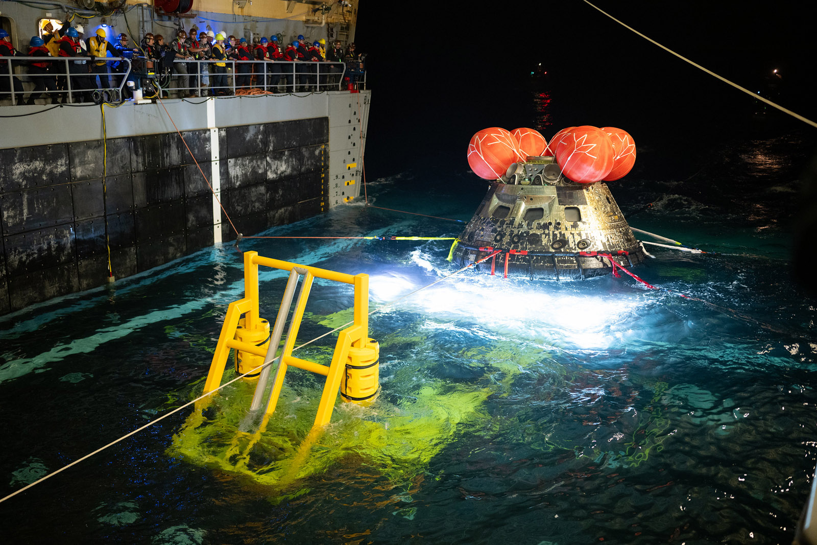 Hlavním záchranným plavidlem byla výsadková loď USS Portland (LPD-27), která koordinovala operaci v oblasti dopadu. Astronauti byli pomocí člunů a vrtulníků MH-60S Seahawk přepraveni na její palubu, kde podstoupili první lékařské prohlídky. Samotná kabina Orion byla následně vyzdvižena na palubu pomocí jeřábového systému.