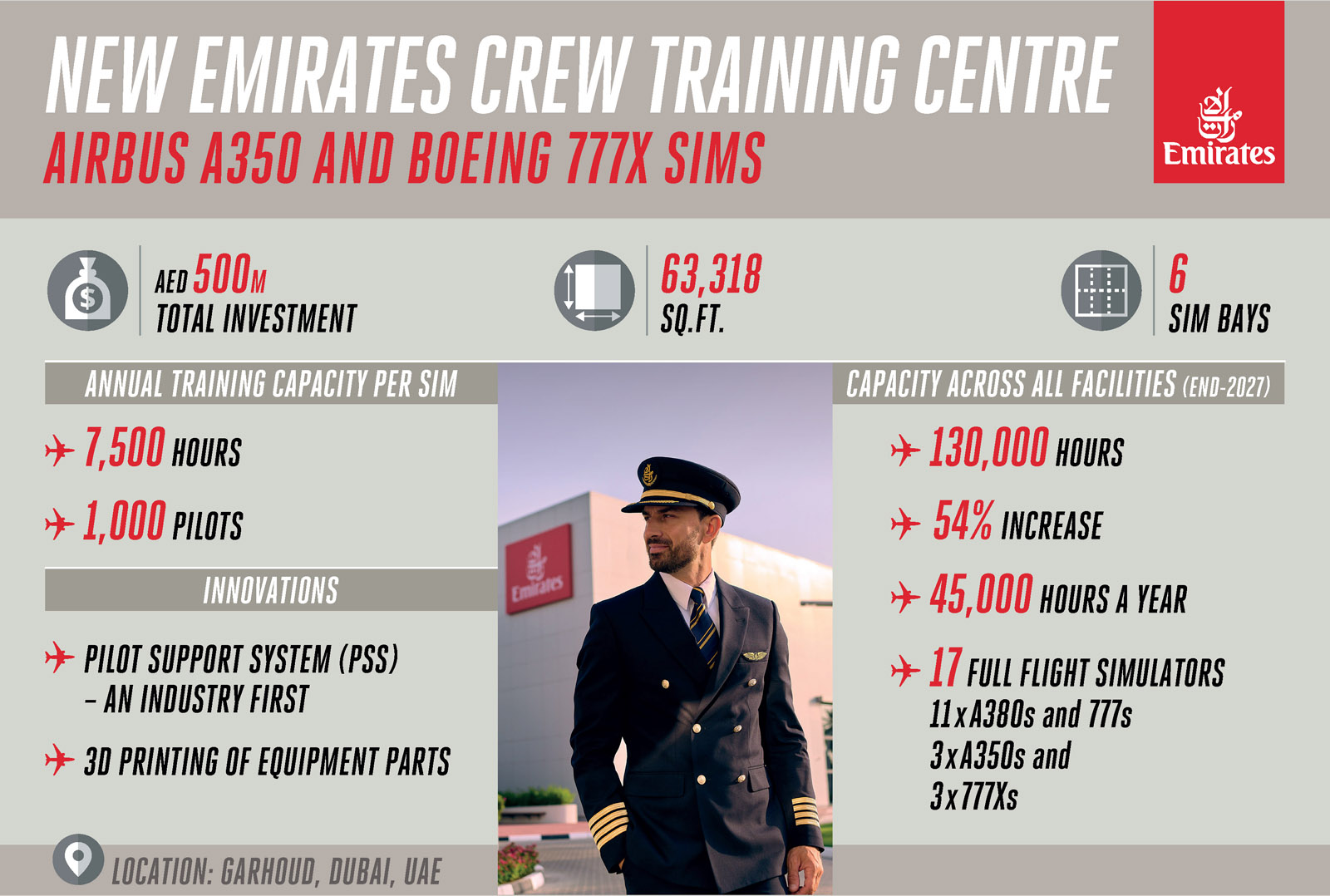 Každý simulátor poskytne až 7500 hodin výcviku ročně pro maximálně 1000 pilotů. Jakmile bude centrum plně funkční, piloti Emirates budou mít k dispozici celkem 17 simulátorů, a to včetně 11 simulátorů pro výcvik na A380 a Boeing 777. Ve všech svých zařízeních se tak kapacita Emirates zvýší o 54 % a nabídne každoročně přes 130 000 hodin výcviku.