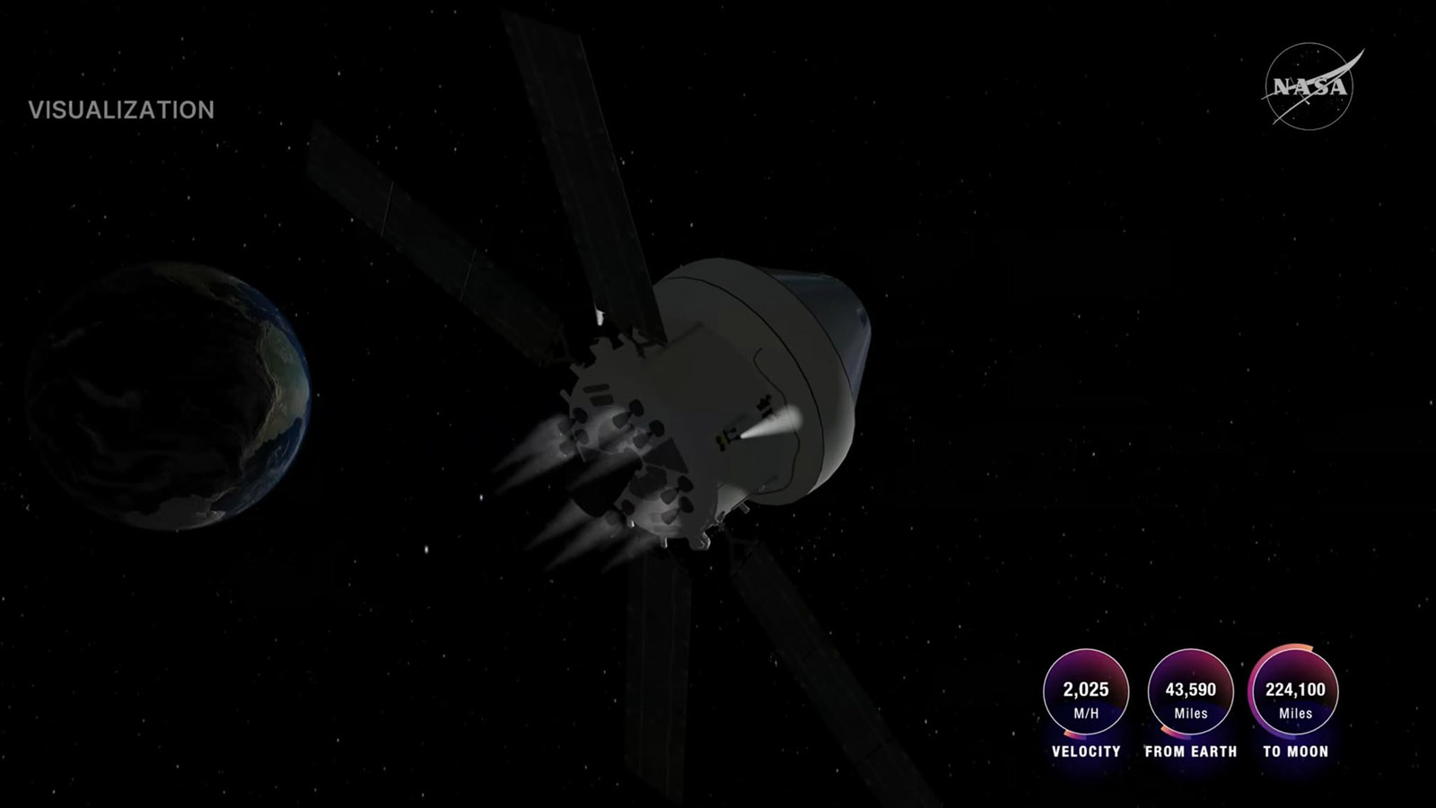 Od samotného startu došlo již k oddělení horního stupně ICPS (Interim Cryogenic Propulsion Stage) a po postupném oživení dalšího palubního vybavení (například ohřívače jídla) bylo provedeno důležité testování manévrovacích schopností lodi Orion. To je jeden z logických důvodů, proč posádka po startu nezamířila rovnou na orbitu kolem Měsíce.
