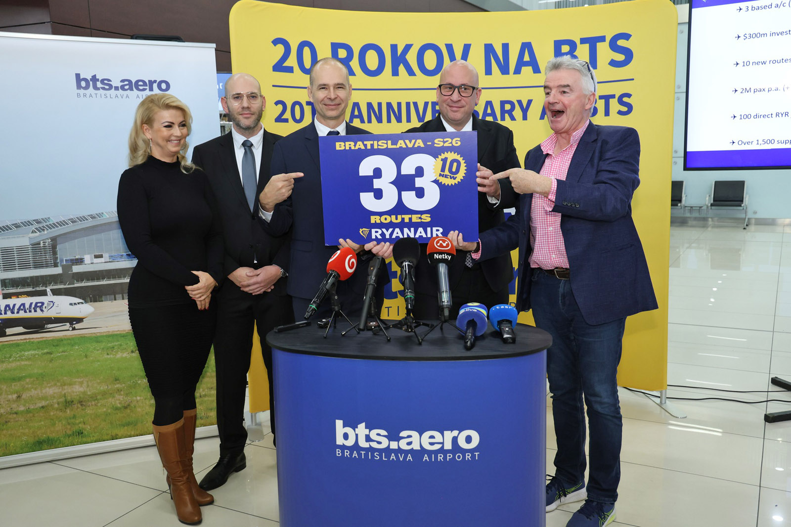 Celkovo 33 pravidelných leteckých liniek, z toho 10 nových, bude počas letného letového poriadku 2026 zabezpečovať z Letiska M. R. Štefánika letecký dopravca Ryanair. Svoju rekordnú letnú ponuku leteckých spojení predstavil v Bratislave šéf najväčšieho nízkonákladového leteckého dopravcu v Európe – Michael O′Leary z Ryanair, ktorý si zároveň v odletovej hale bratislavského letiska pripomenul 20. výročie pôsobenia Ryanairu v Bratislave.