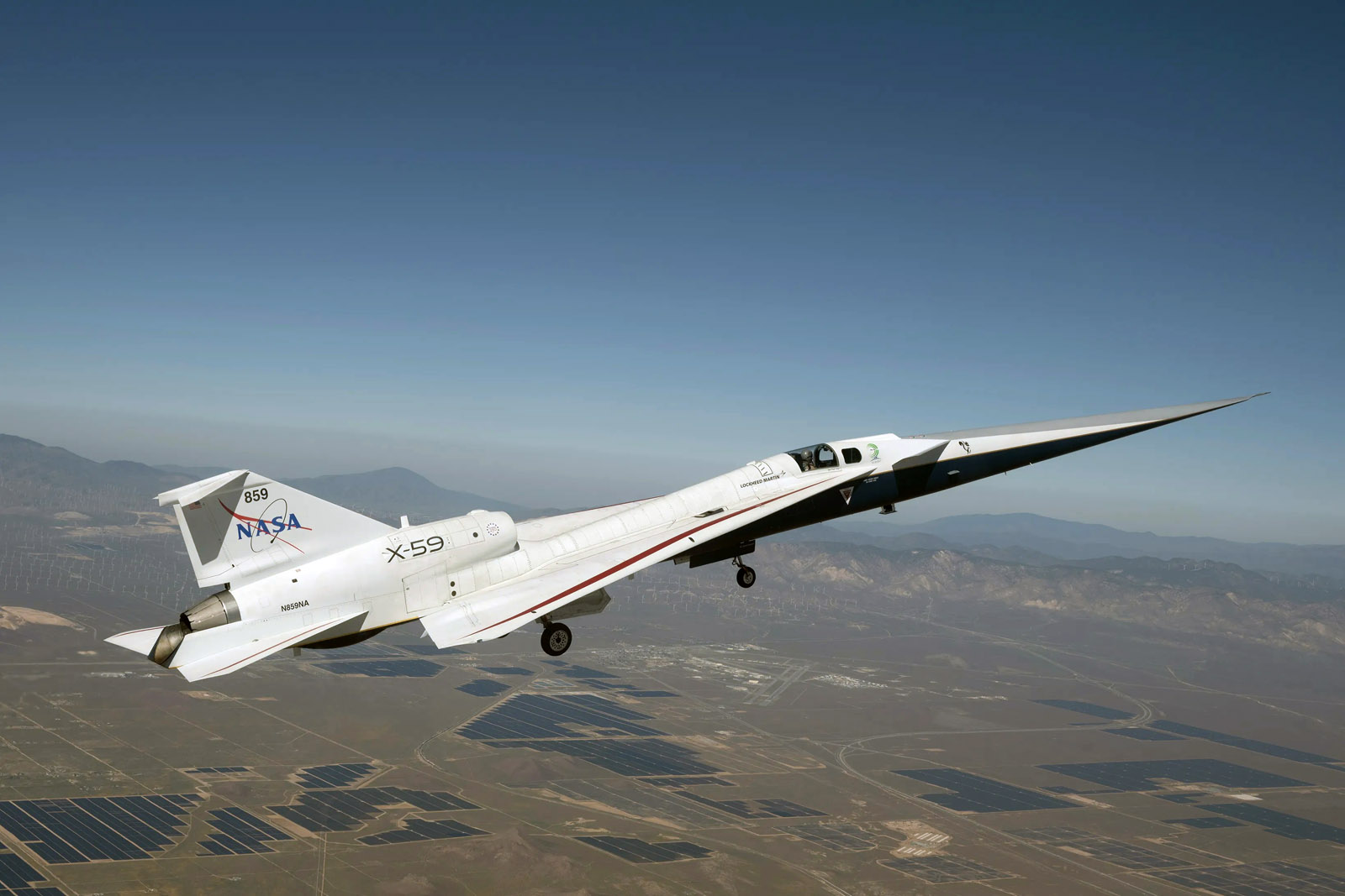 X-59 při svém druhém krátkém letu 20. března 2026 poblíž NASA Armstrong Flight Research Center v Kalifornii