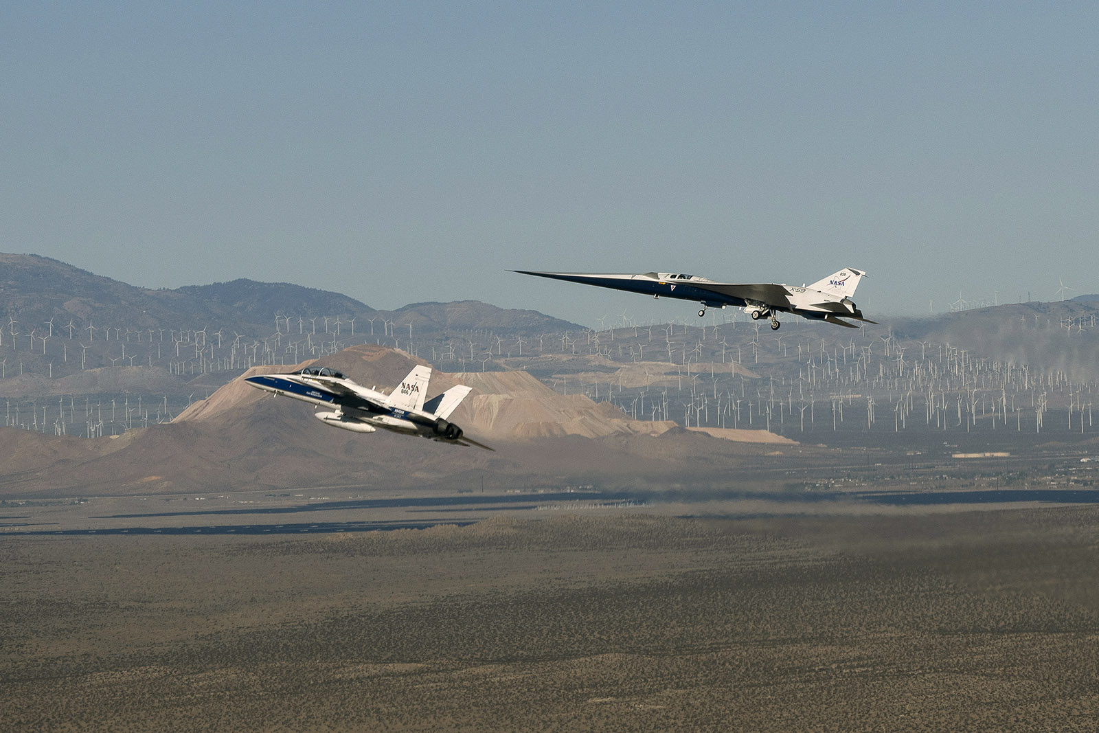 Výzkumný letoun NASA F/A-18B sleduje X-59 během prvního letu dne 28. října 2025 při letu směrem k NASA Armstrong Flight Research Center na Edwards Air Force Base