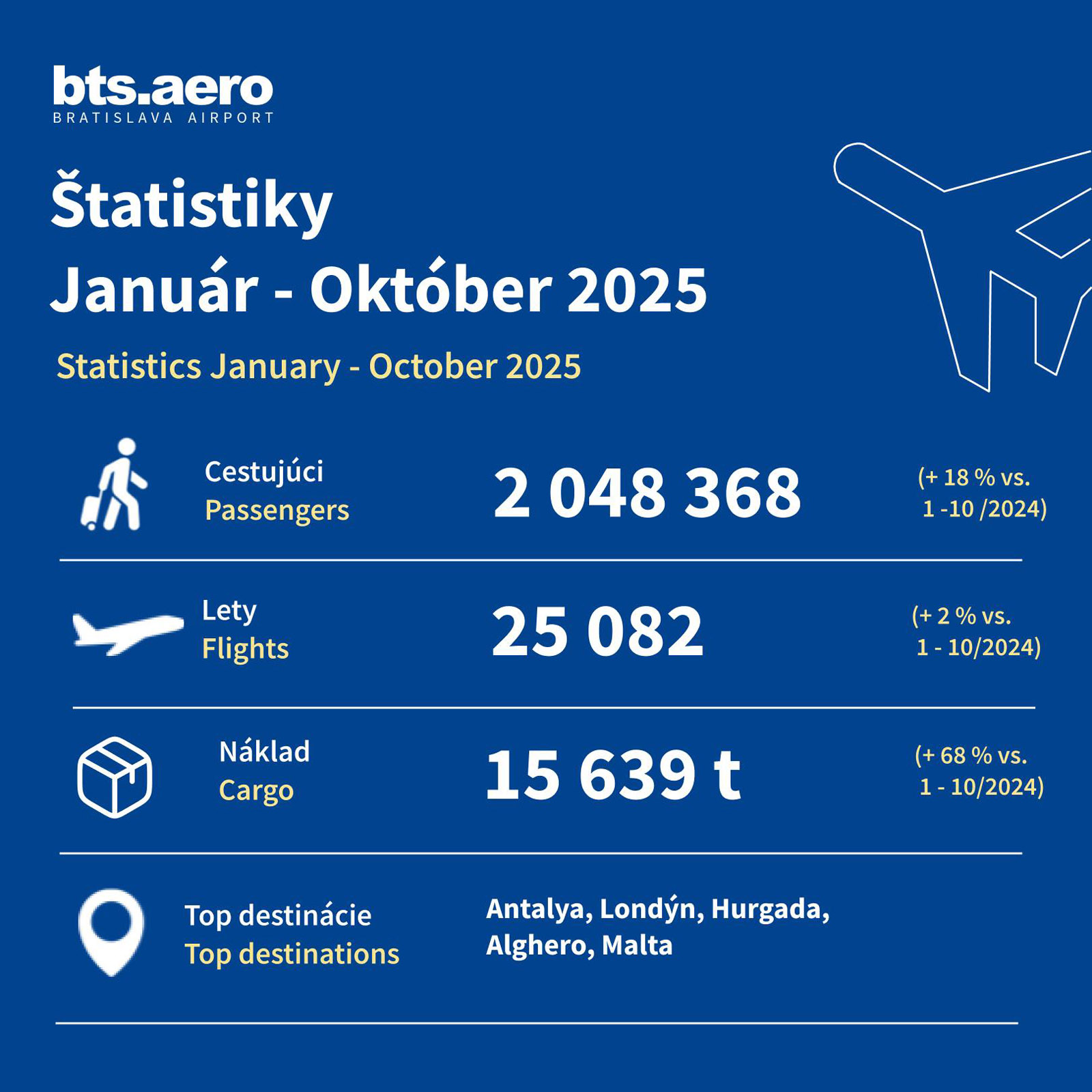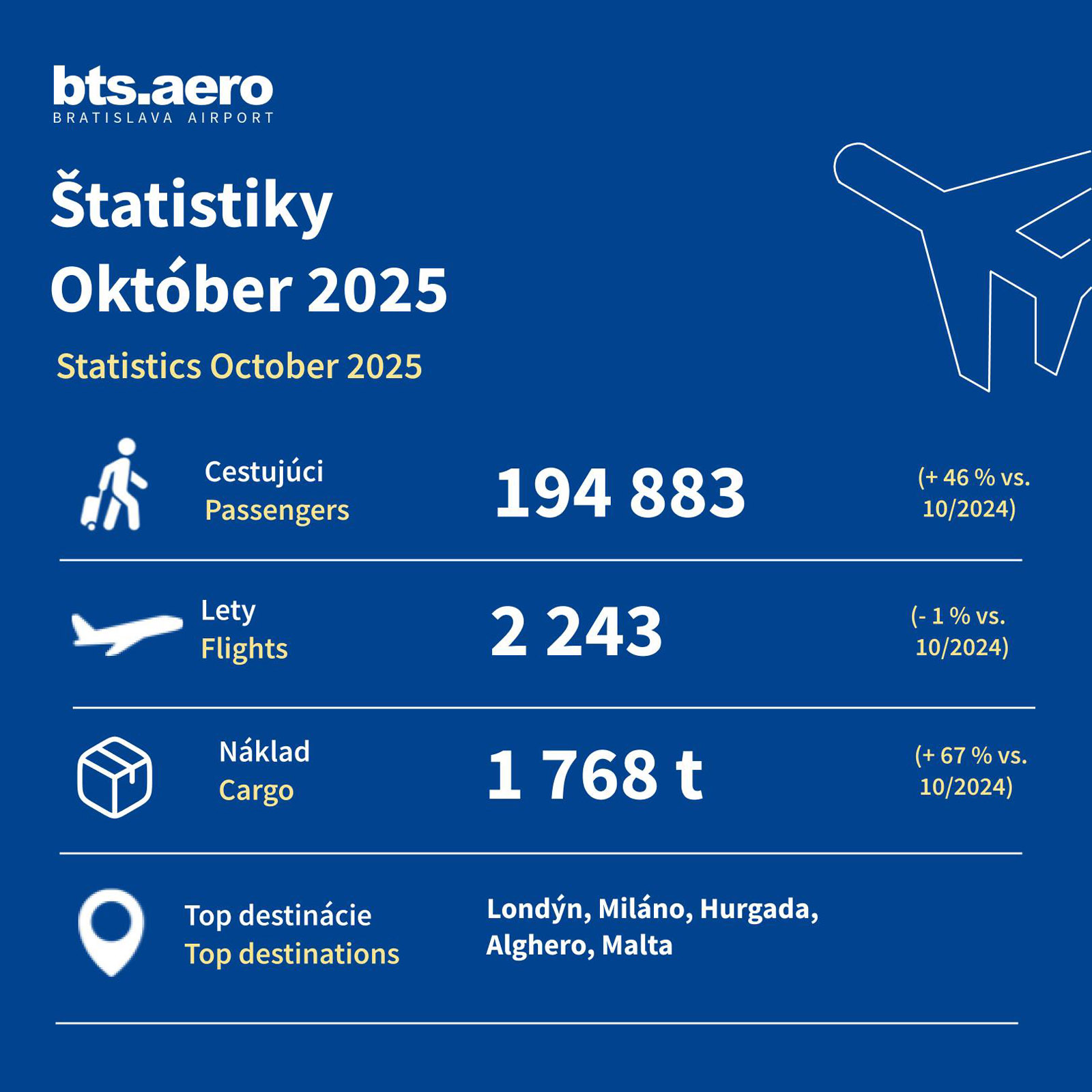 V októbri odlietalo najviac cestujúcich z Bratislavy do Londýna (spolu letiská Stansted a Luton), Milána, egyptskej Hurgady, do Alghera a na ostrov Malta. Celkovo sa uskutočnilo v októbri 2 243 letov. Od začiatku roka do konca októbra eviduje letisko v Bratislave už 25 082 vzletov a pristátí lietadiel.