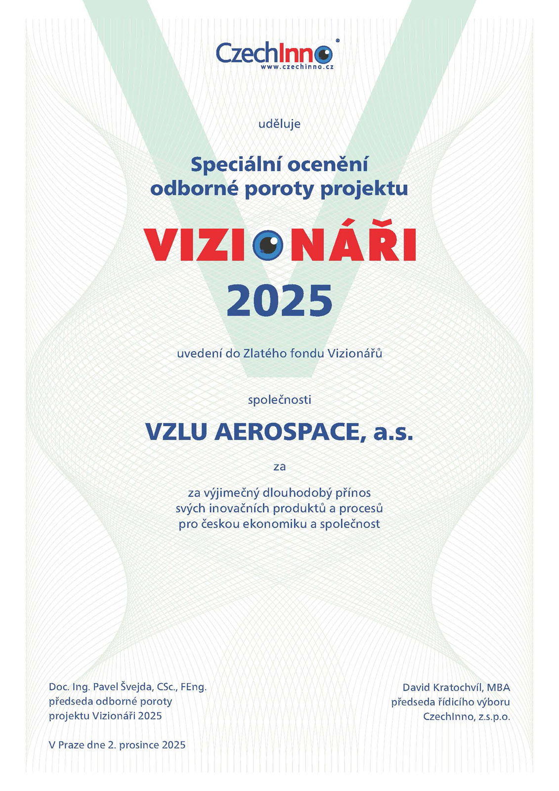 V rámci slavnostního večera Vizionář 2025 získala společnost VZLU Aerospace speciální ocenění, byla uvedena do do Zlatého fondu Vizionářů (tato cena byla udělen a poprvé).
