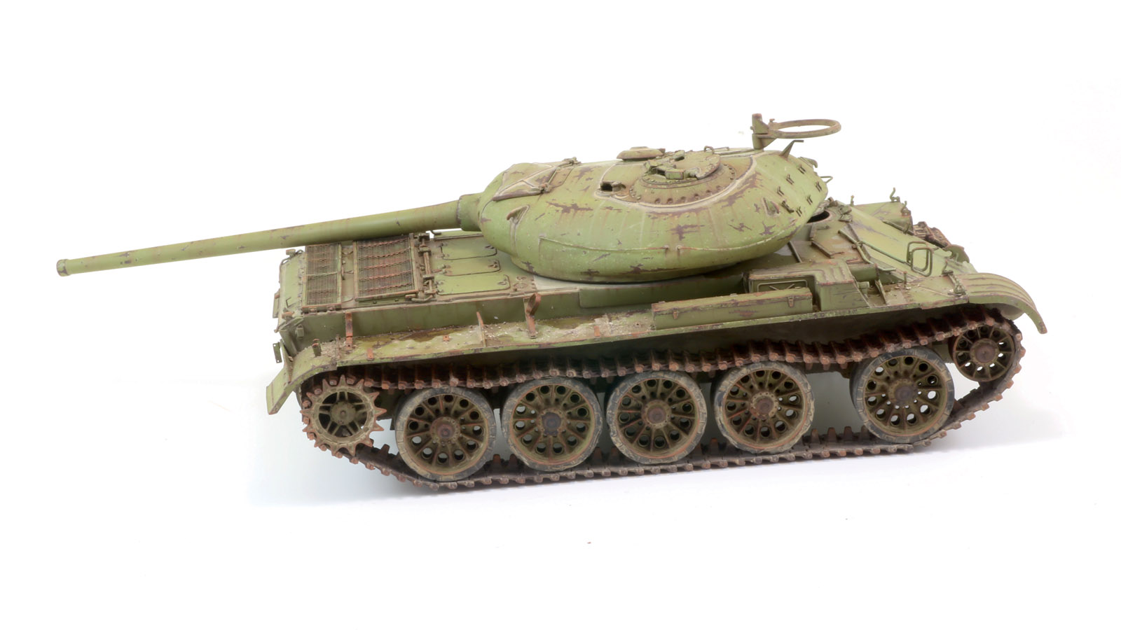 Ukrajinská firma Miniart první variantu tohoto ikonického tanku ztvárnila dokonale a model můžeme postavit rovnou z krabičky včetně interiéru a motoru. Díly vnitřku se místy dostávají na limity technologických možností vstřikování plastu a rozhodl jsem se, že model raději postavím bez „vnitřností“. Nechtěl jsem stavět model se zbarvením z krabičky, ale jako předlohu si vybral vozidlo, které stálo na vojenské základně ponecháno několik desetiletí napospas vlivům přírody