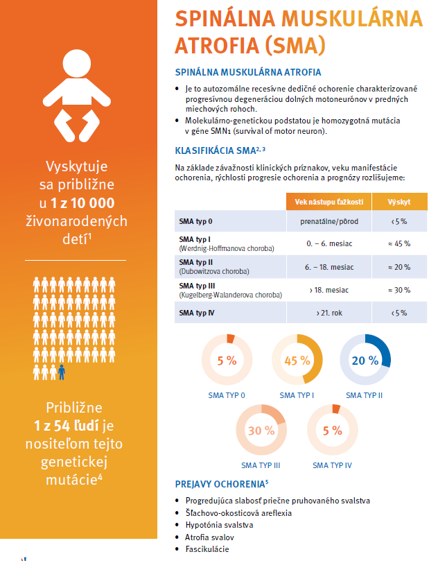 Spinálna muskulárna atrofia je dedičné nervovo-svalové ochorenie, ktorého hlavným klinickým príznakom je slabosť svalov, pričom najviac sú postihnuté dolné končatiny a menej horné. Postihnuté je však celé vôľou ovládané tzv. priečne pruhované svalstvo, vrátane dýchacích, prehĺtacích a hrudných svalov. Rozumové a zmyslové schopnosti detí so SMA ale nikdy nie sú postihnuté.