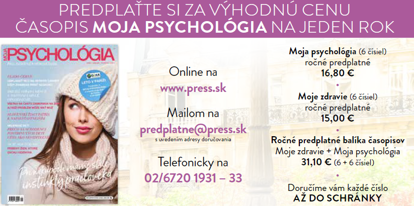 Milí naši čitatelia, nevieme si predstaviť, že by sme vás nemali. Preto by sme vás radi pozvali do rodiny predplatiteľov, aby ste sa mohli spoľahnúť, že žiadne číslo vášho časopisu vám už nikdy neunikne. PREDPLAŤTE SI do konca júna 2025 lifestylový magazín MOJA PSYCHOLÓGIA a v lete môžete začať plánovať výlet do Paríža s cestovnou kanceláriou DAKA alebo sa tešiť z množstva ďalších skvelých cien. Každý nový predplatiteľ bude totiž zaradený do Veľkej predplatiteľskej súťaže, v ktorej vás opäť čakajú zaujímavé výhry.